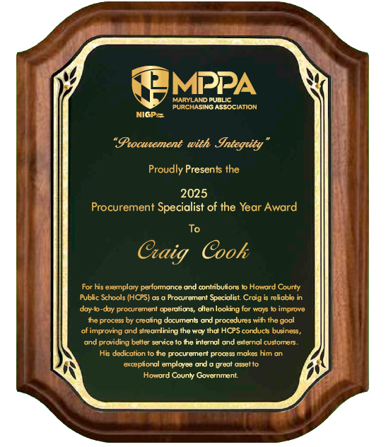 Craig Cook, Procurement Specialist for Howard County Public Schools (HCPSS), has been recognized as a 2025 Procurement Specialist of the Year Award nominee for his exceptional dedication, technical skill, and commitment to supporting critical school system operations through effective procurement.