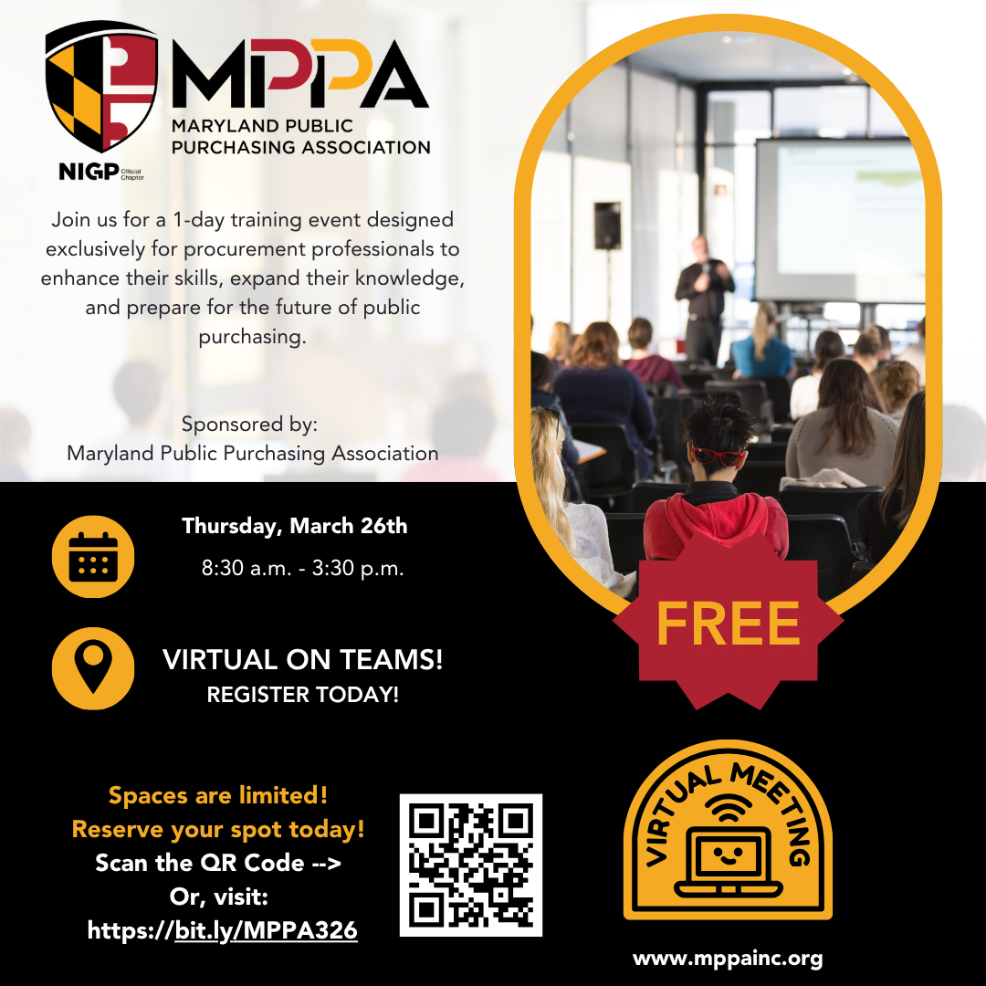 The Maryland Public Purchasing Association, Inc. (MPPA) is a professional organization comprised of over 300 procurement professionals throughout the State. MPPA, Inc. members represent various public purchasing entities including the federal government, state, cities, counties, colleges and universities, libraries, hospitals, commissions and other public agencies. MPPA, Inc. is the local chapter of the National Institute of Governmental Purchasing (NIGP), which has over 70 chapters in the United States, Canada, and internationally.